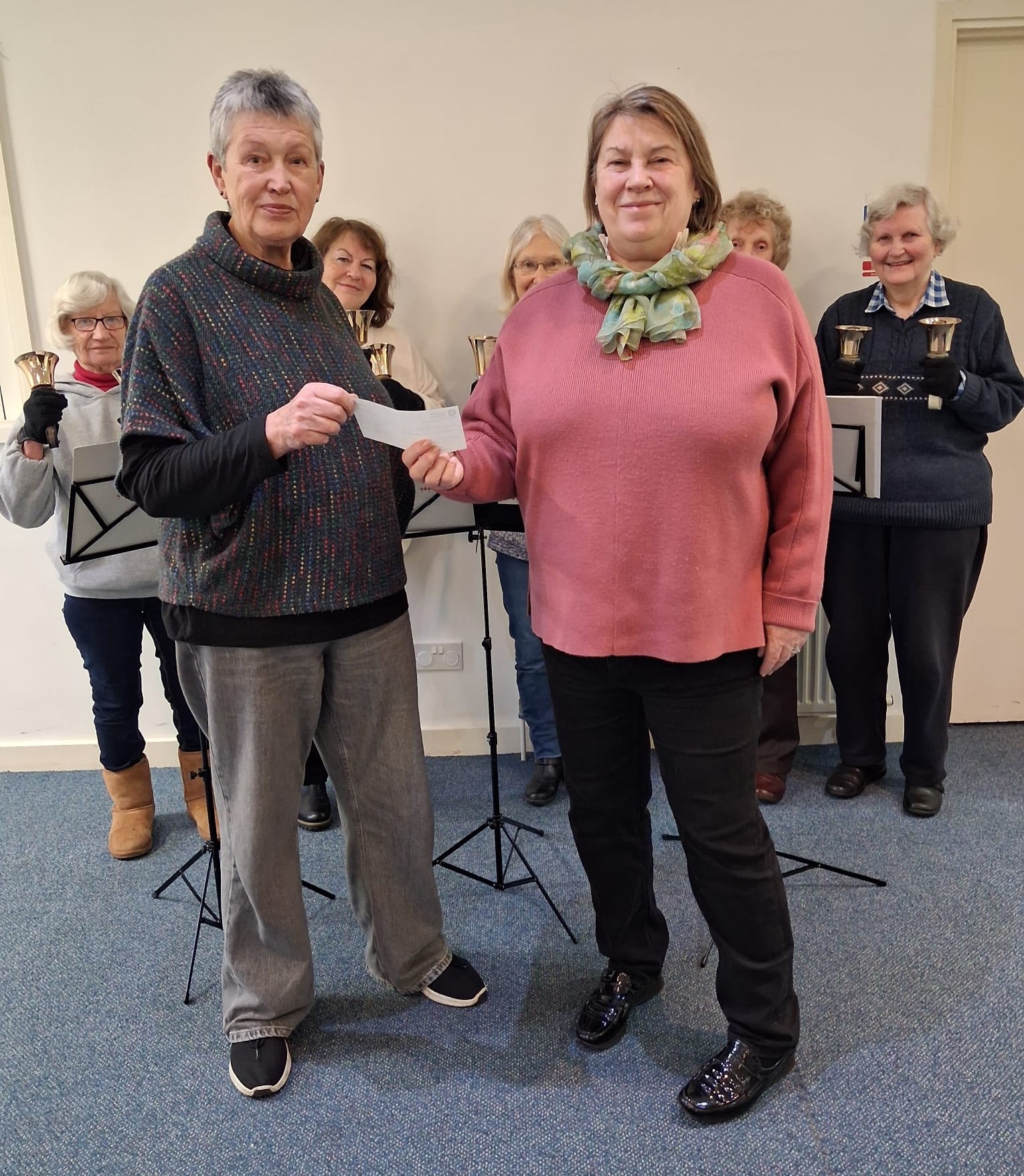 Our leader, Mary McGregor is seen here presenting a cheque for £150 to Rhona Christie from the local branch of Riding for the Disabled. The money was donated by Tesco customers before Christmas when the Blair Bells played Christmas music in store.